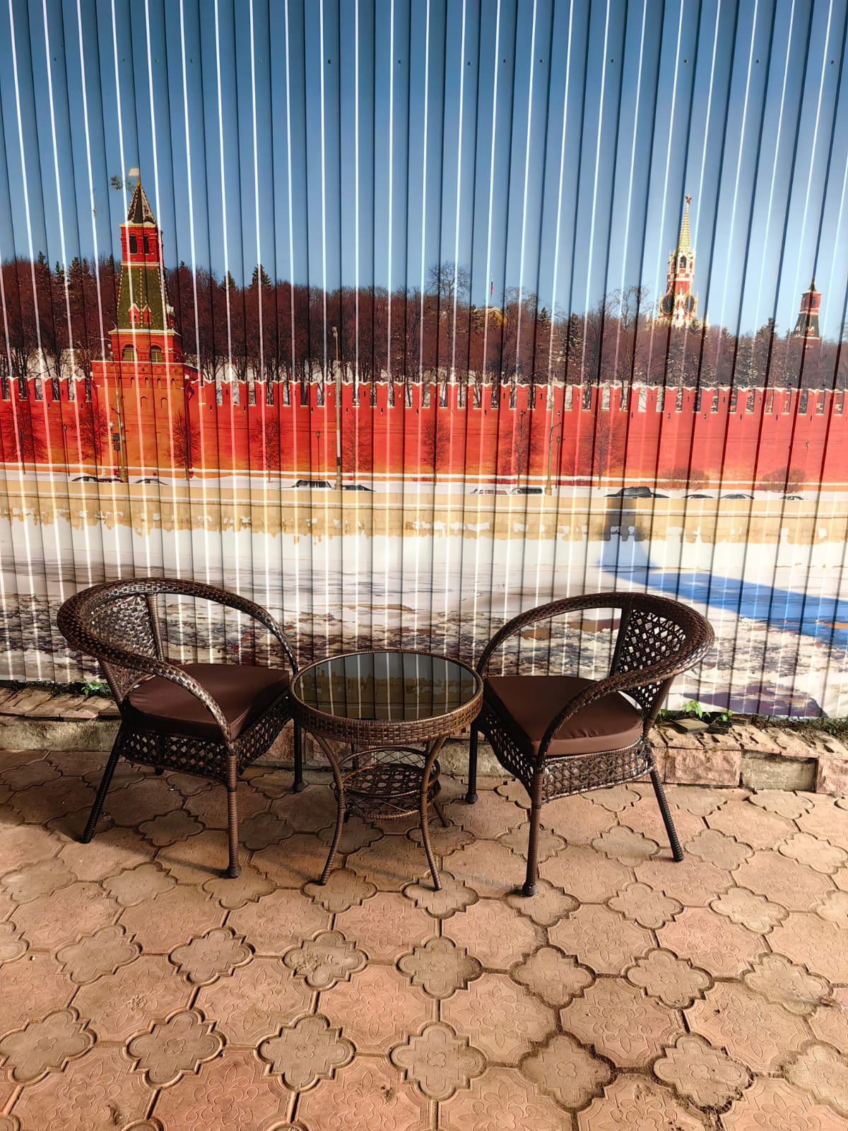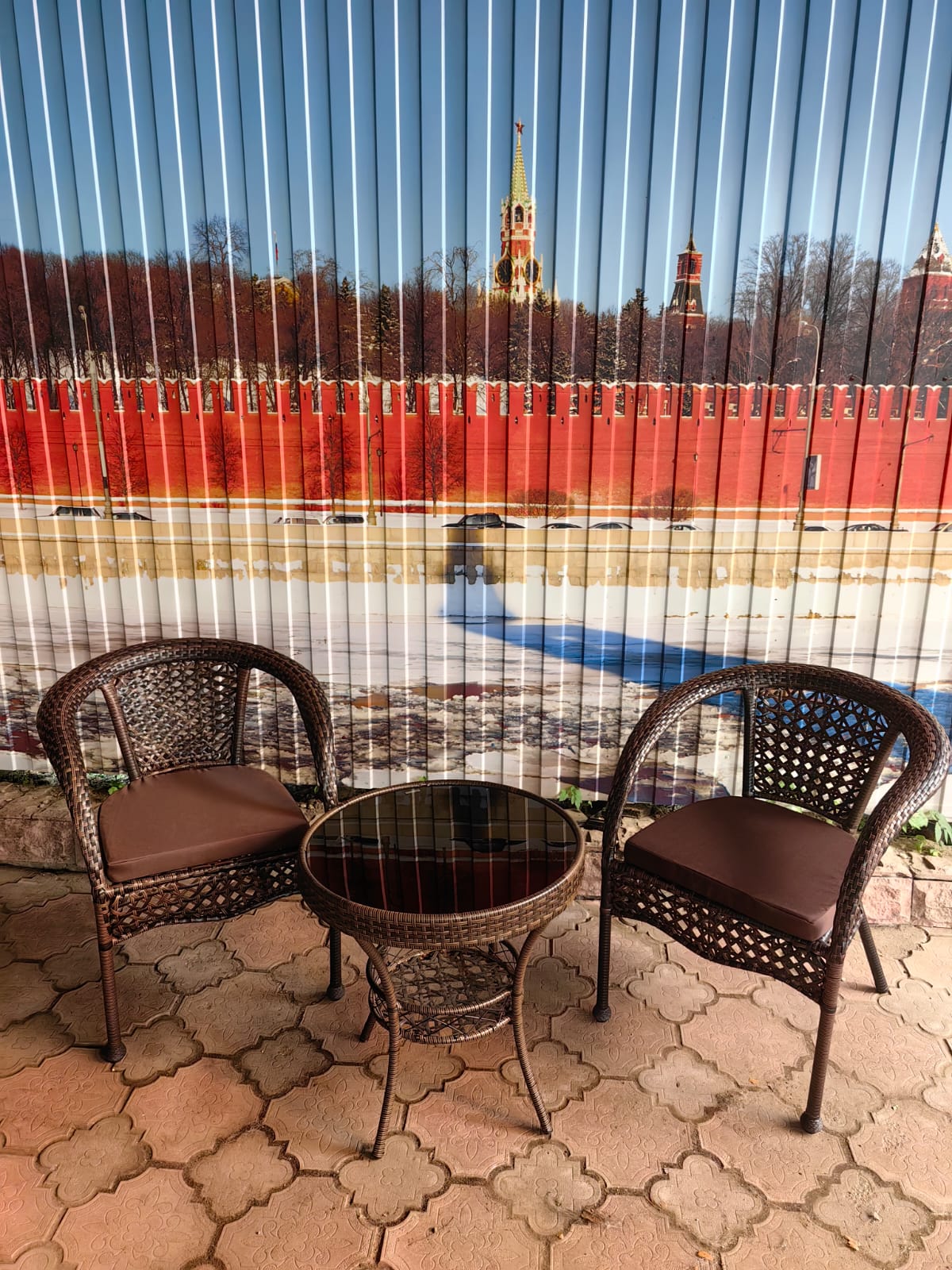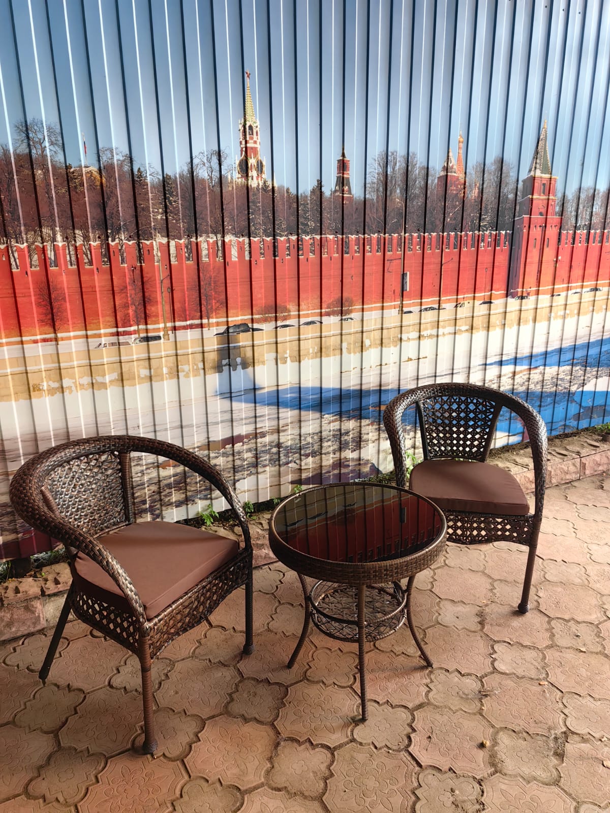 Стол Фуджи: Светлый цвет, создающий ощущение свежести и легкости.# Кофейный набор из искусственного ротанга: Стол Фуджи и два кресла Руардин Шоколад