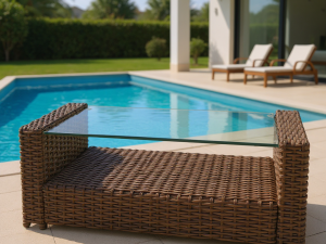 - Плетеные столы со столешницами из закаленного стекла, небольшие журнальные и сервировочные столики;